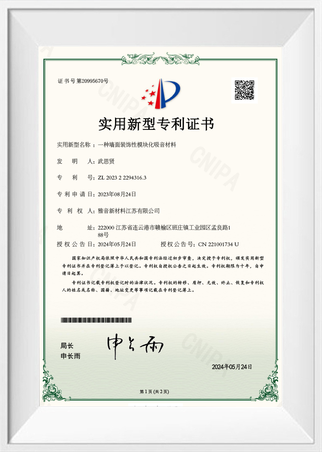 Patentcertificaat voor een modulair geluidsabsorberend materiaal voor wanddecoratie
